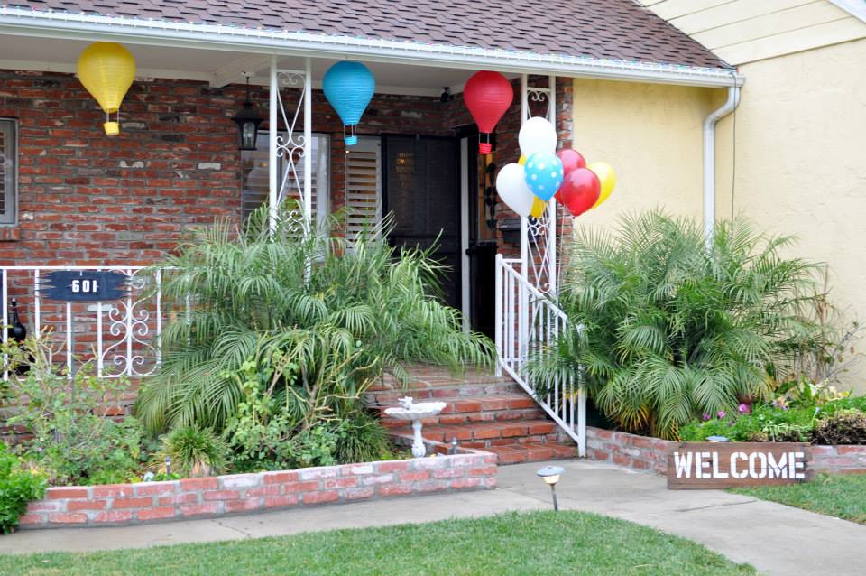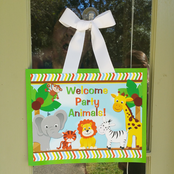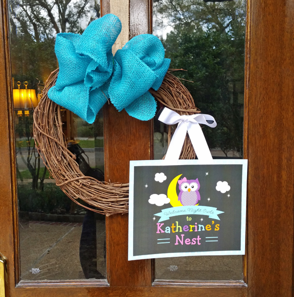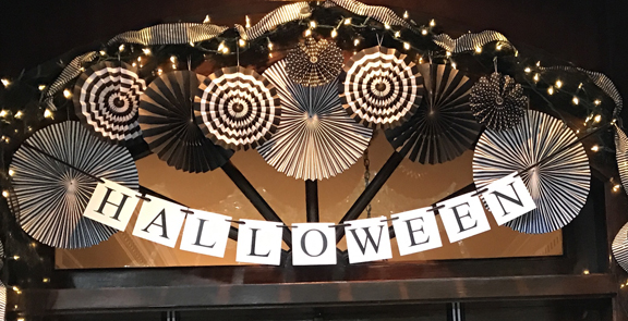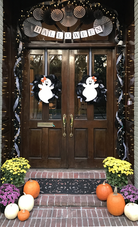 Black and white decorative mesh, ribbons, and twinkling lights gave a warm welcome to costumed party goers. Black and white pin wheels and ghosts were intertwined in the door decorations and a “Halloween” banner completed the entrance!