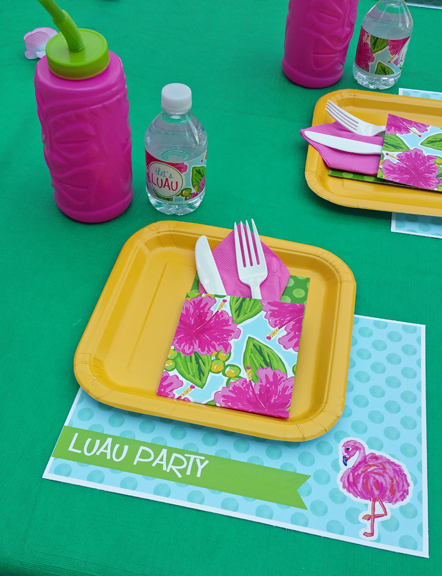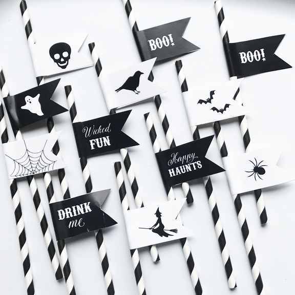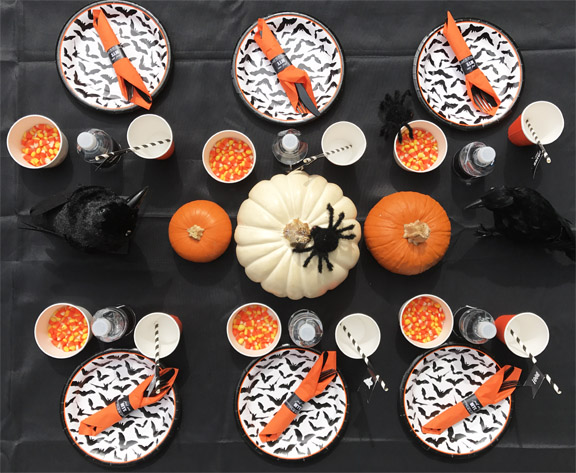 The table was set with black and white bat plates with an orange rim, orange napkins with personalized black and white napkin rings reading “just one BITE”, orange cups with black and white stripe straws with scary fun straw flags, and cups of candy corn.
