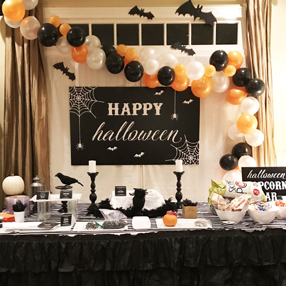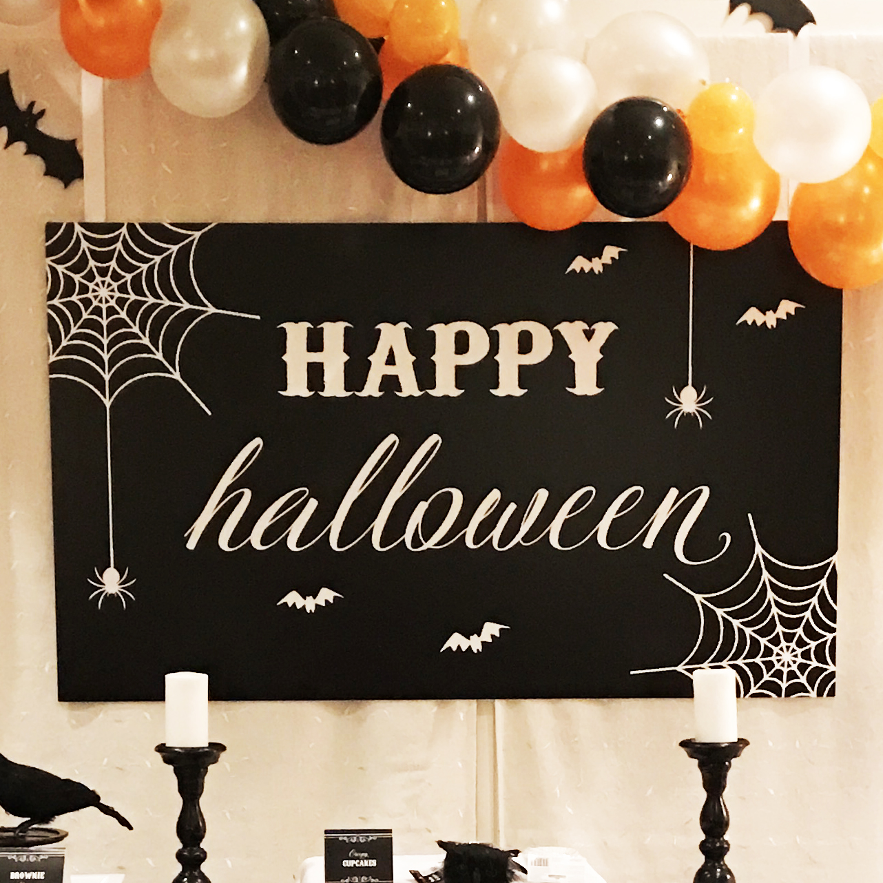 A black and white backdrop saying “HAPPY Halloween” with spiders and spiderwebs hung over the refreshments table.