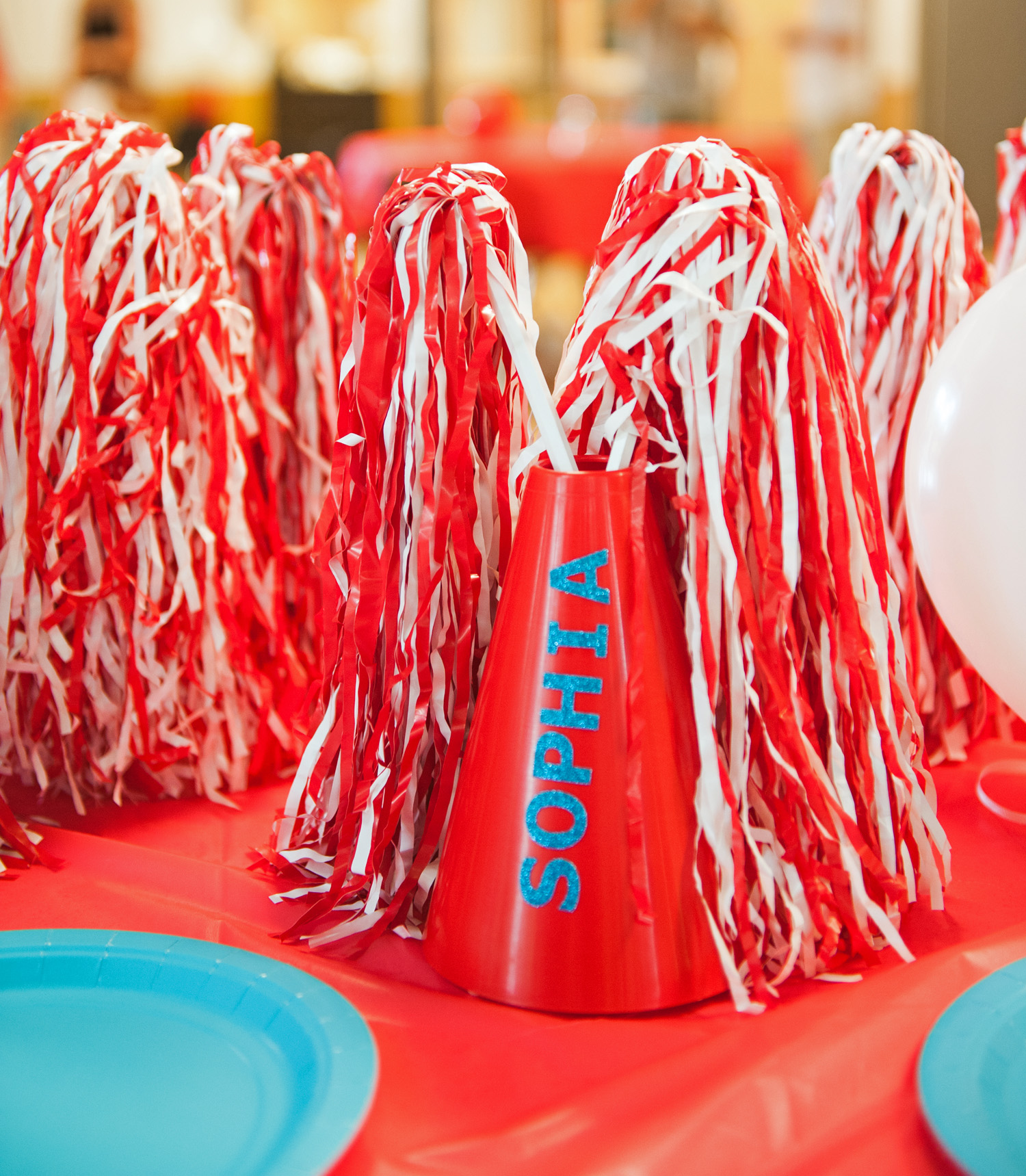 Party tables were set up for them with a megaphone with their names on it, so the girls knew where to sit. They were given pom poms in the party colors to learn the cheers!