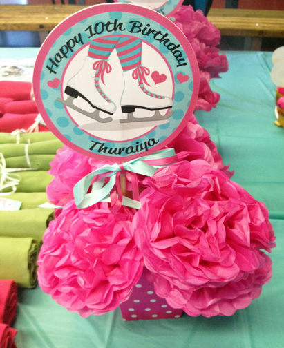 Colorful winter scarves for the girls were also neatly tied with a thank you favor tag! “Thank you for skating and twirling with me! Love, Thuraiya!”