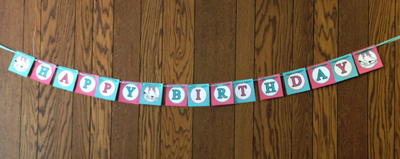 Pink and blue decorations included a Happy Birthday banner and table settings.