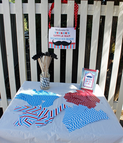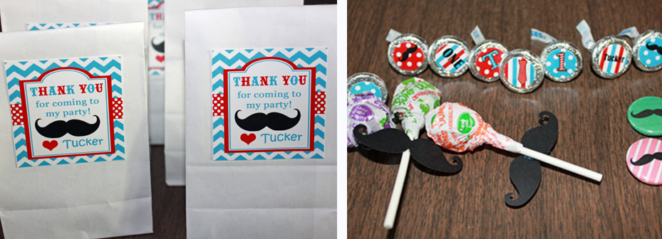 Party Favor Tags in matching invitation style gave another opportunity to thank guests for coming to the grand celebration of this cute little guy! Party themed stickers on Hershey kisses, mustaches on lollipops, and mustache pins were just some of the goodies in the bags.