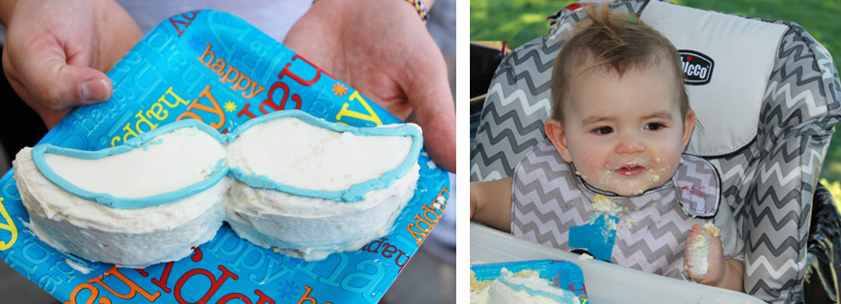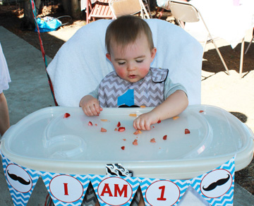 The birthday boy enjoyed his mustache cake in his high chair, which was decorated with “I am 1” party flags and colorful balloons.