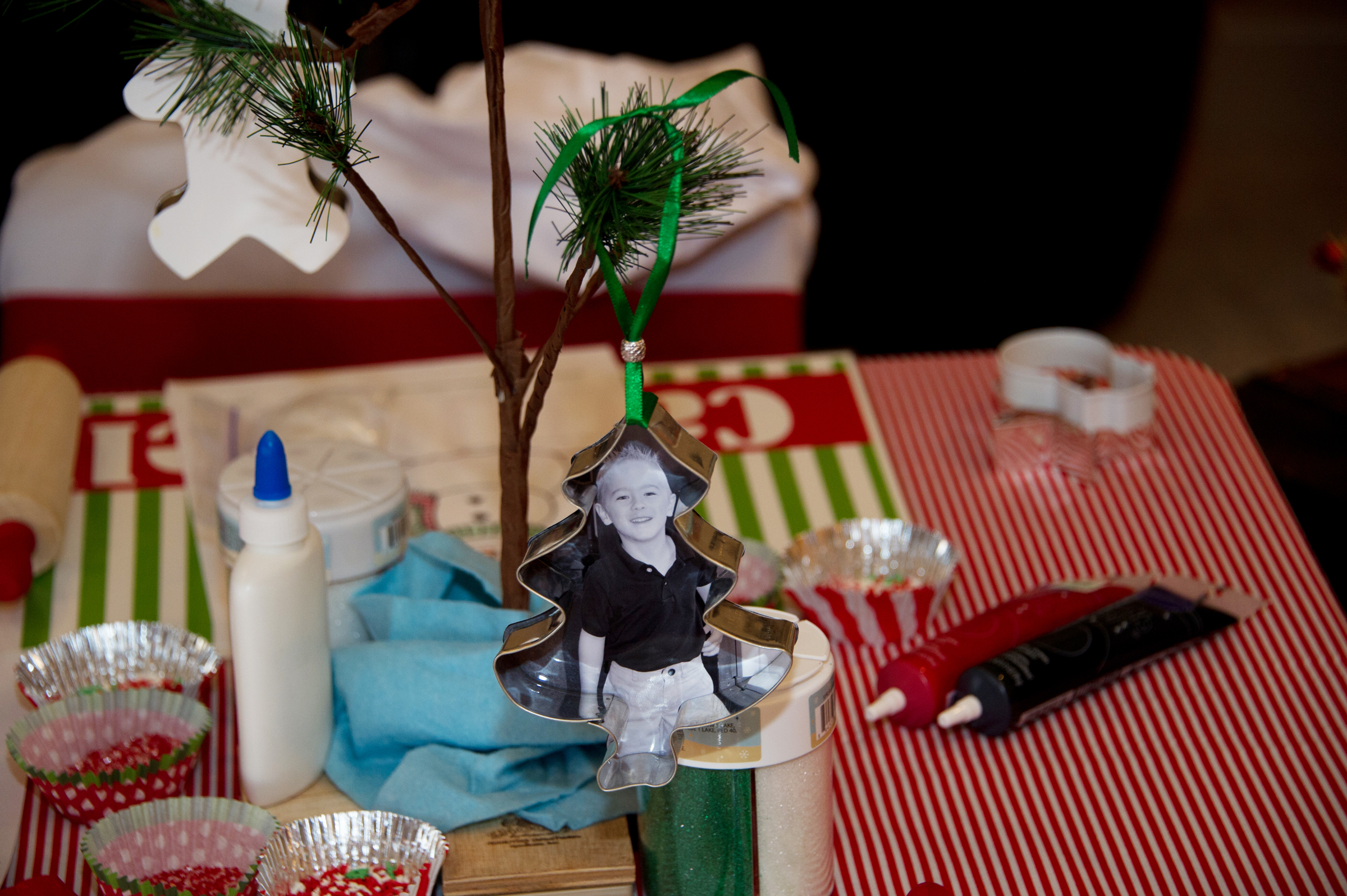 The centerpieces were inspired by Charlie Brown’s Christmas tree, and adorned with vintage cookie cutter tree ornaments featuring a picture of each child!