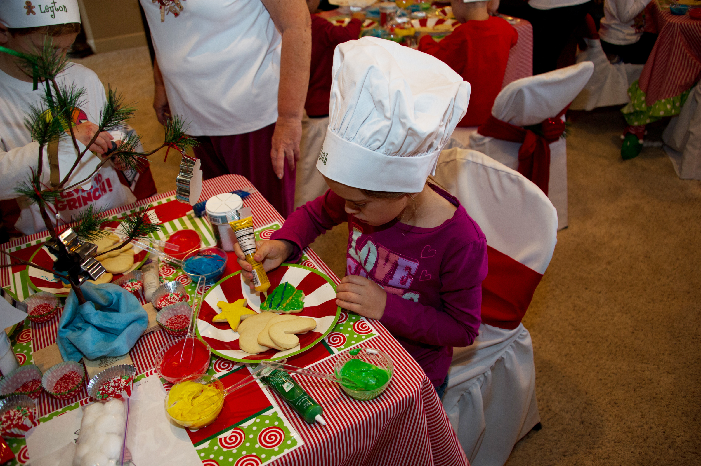 Colorful icings and an assortment of sprinkles allowed each child to express their creativity in decorating the cookies on the red and white candy cane plates.