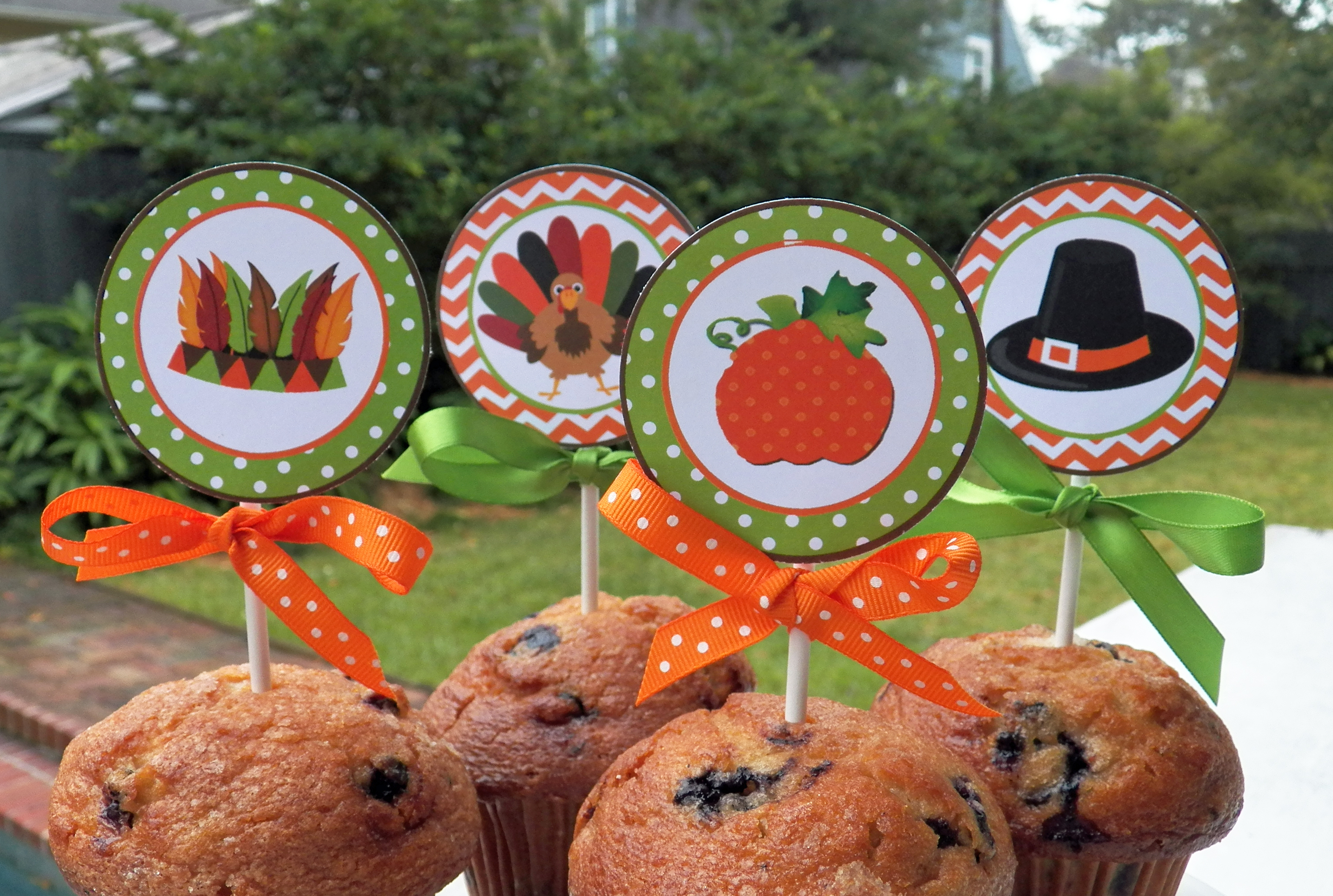 Indian feather headdress, Pilgrim hat, Turkey, and Pumpkin images are featured on cupcake/muffin toppers as well as napkin rings.
