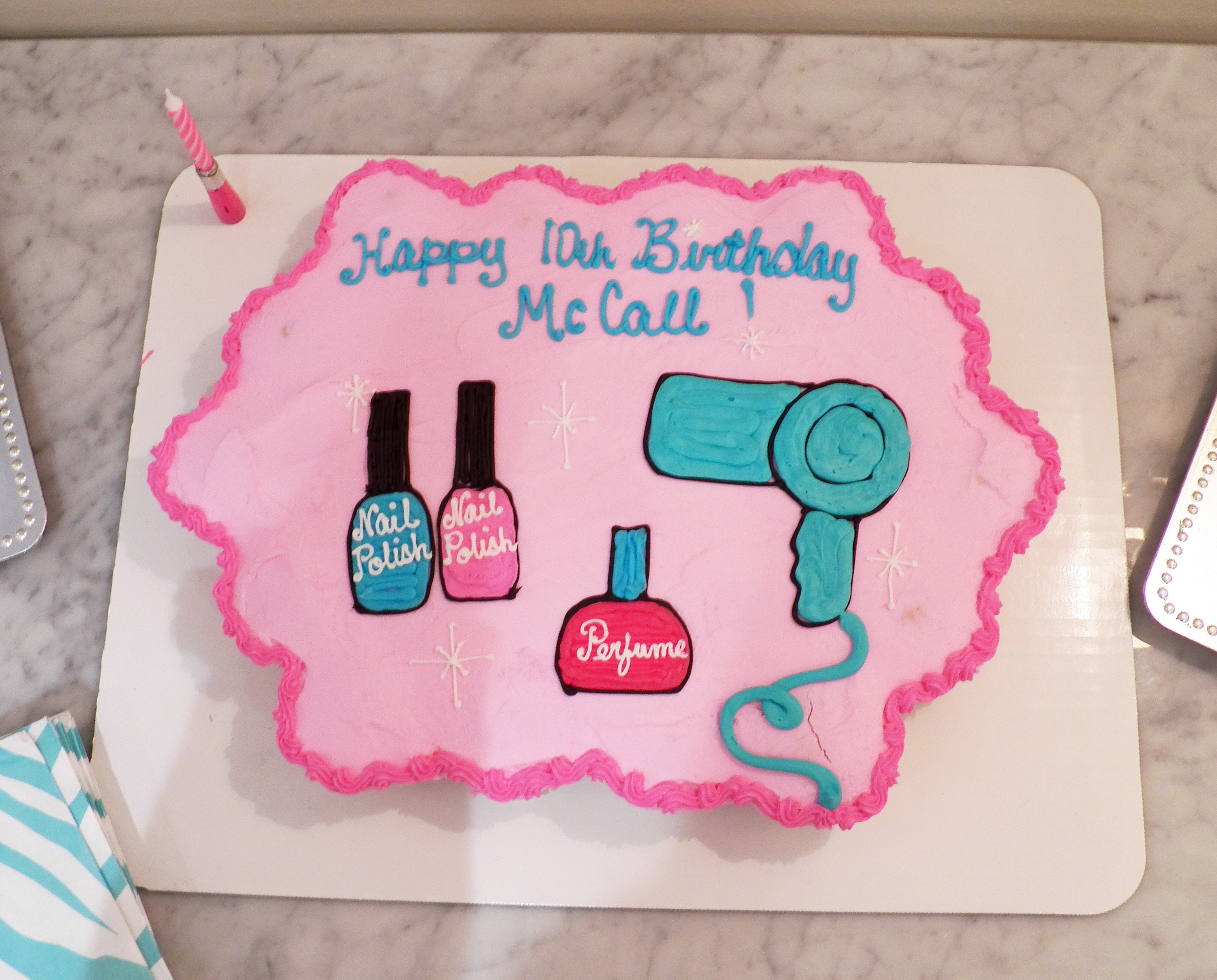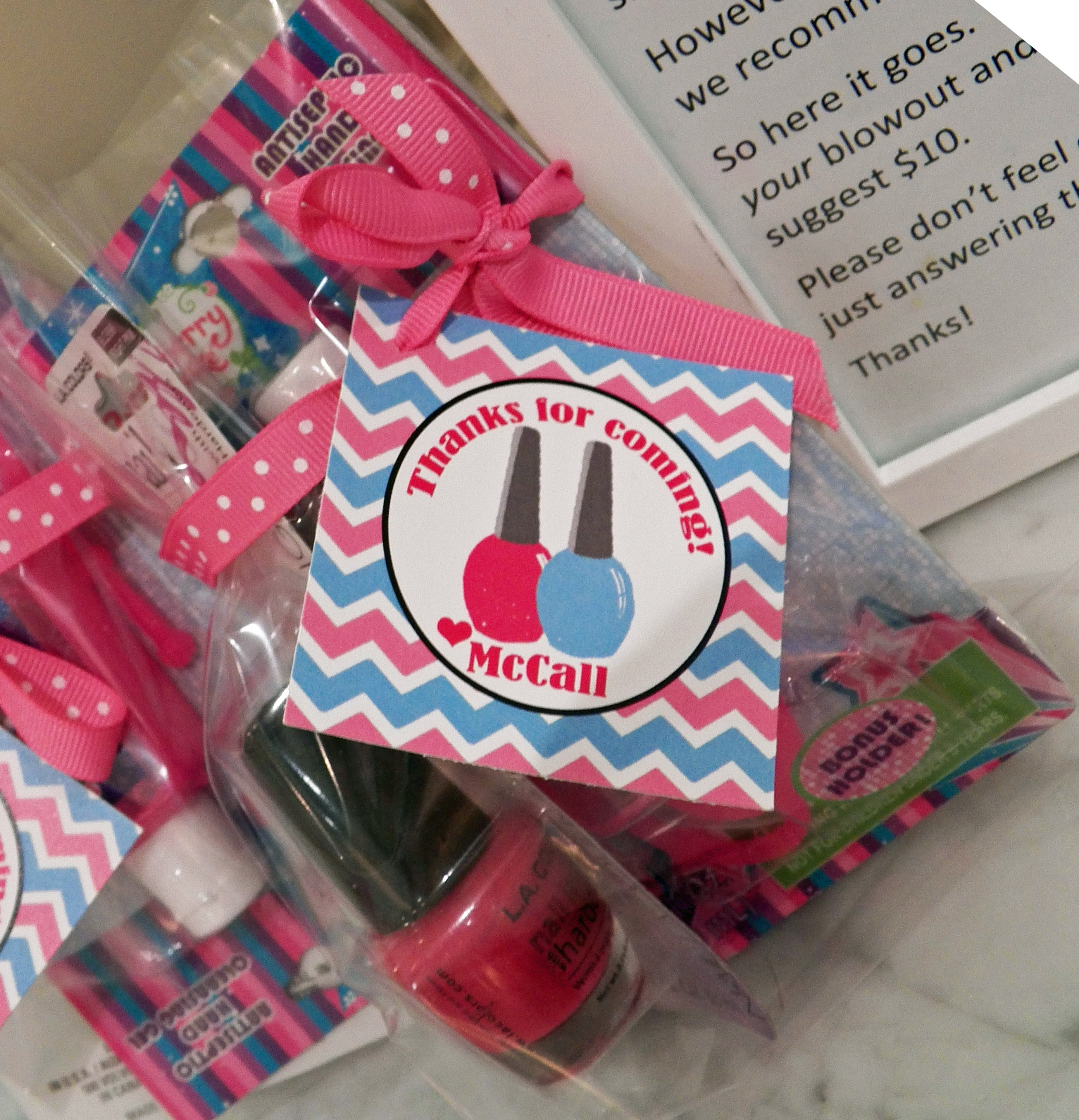 Party favors included emery boards, nail polish, Emi-Jay and a nail brush. Personalized favor tags “Thanks for coming! Love, McCall” were fastened with pink ribbons.