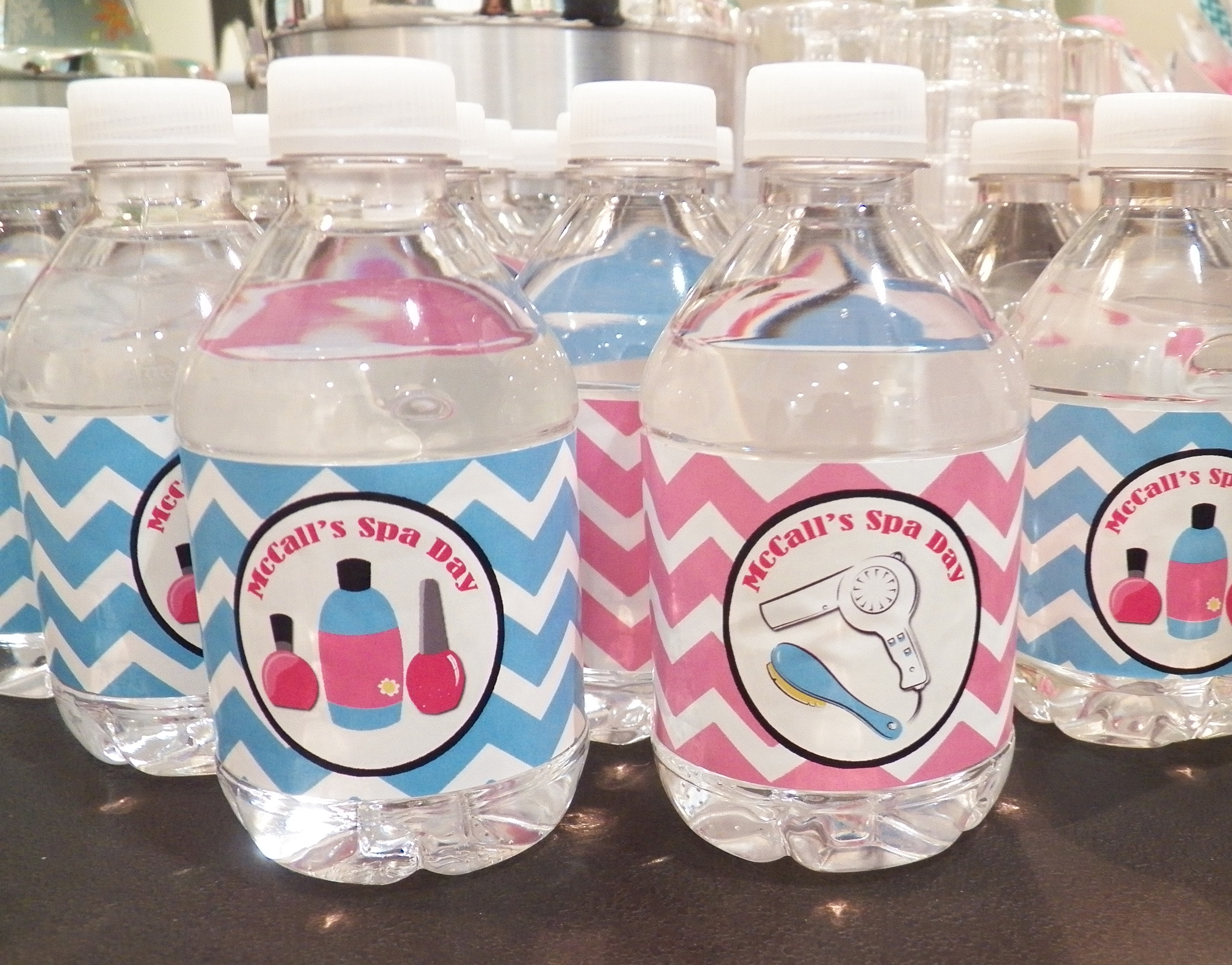 “McCall’s Spa Day” water bottle labels with the pink and blue chevron designs featured spa elements including brush, hair dryer, and nail polish images.