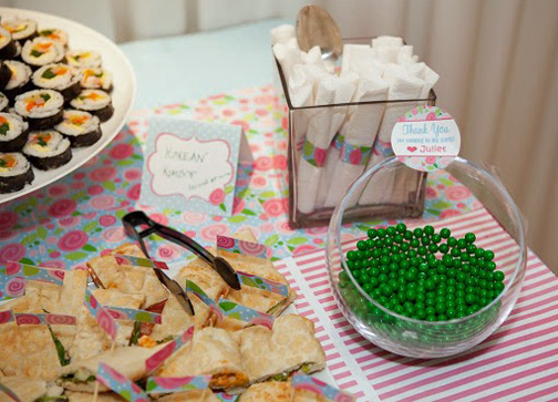The snack and beverage bar was equally phenomenal with Asian Fusion cuisine and cultural favorites, as well as sandwiches, fruit, and cereal. Great attention was given to detail as the table runner, tent style food labels, napkin rings, and toothpick flags were all made with the party’s patterned paper.