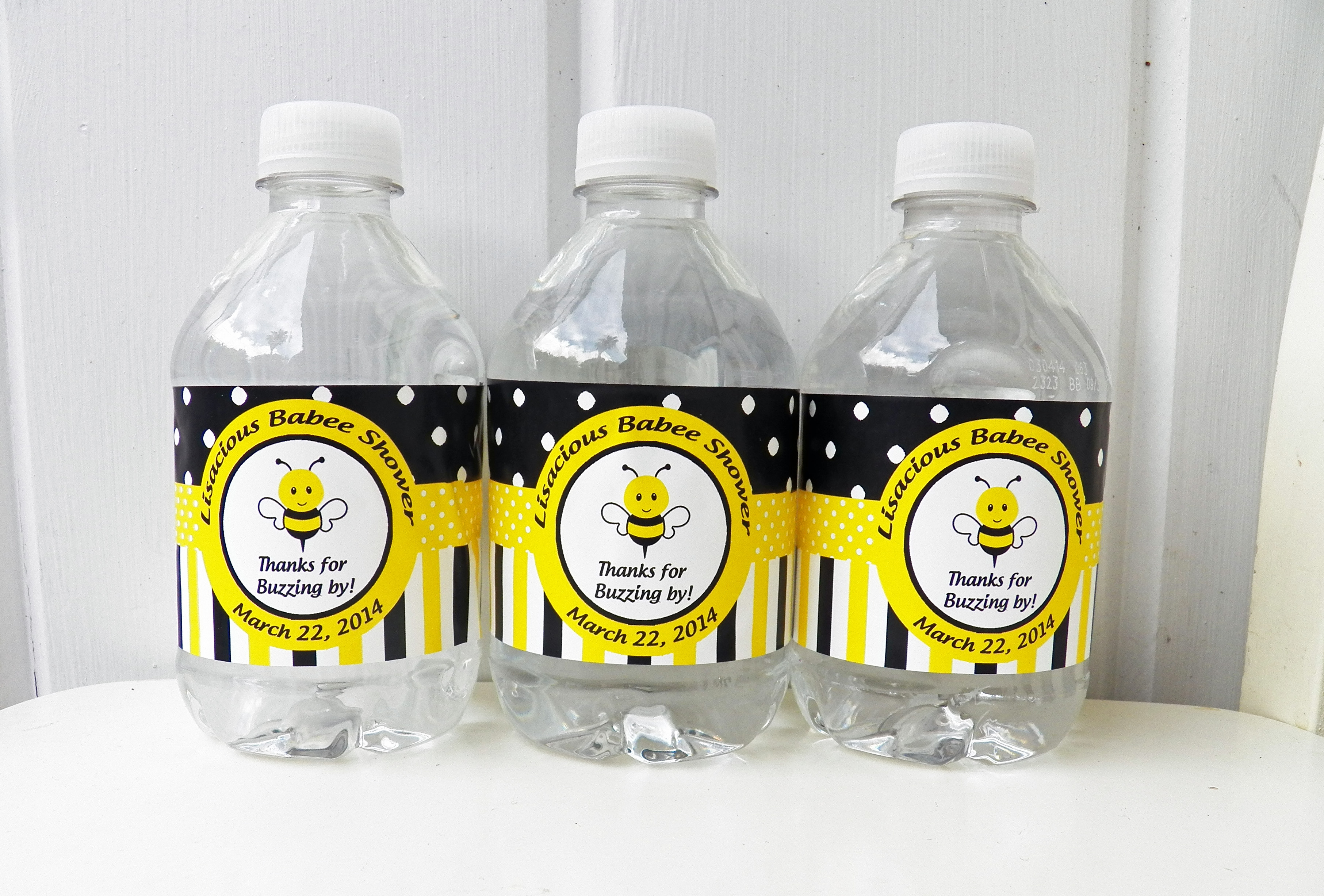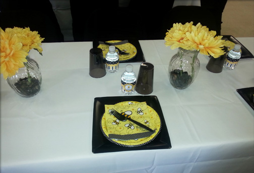 Cute bee themed place settings were perfect for the party styling! Personalized water bottle labels complemented the tableware.