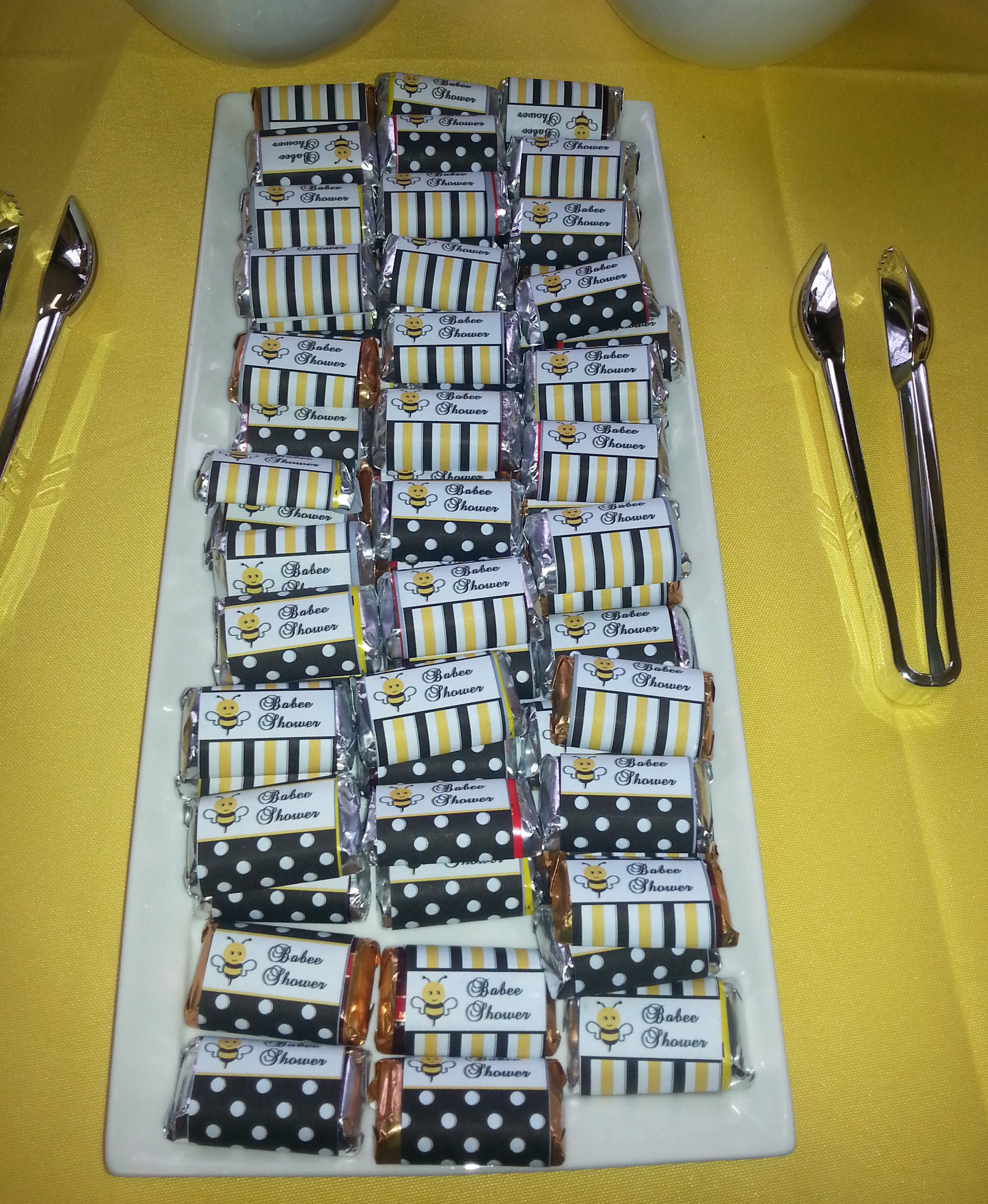 Personalized mini-chocolate candy bars were wrapped in yellow and black carrying out the party theme.