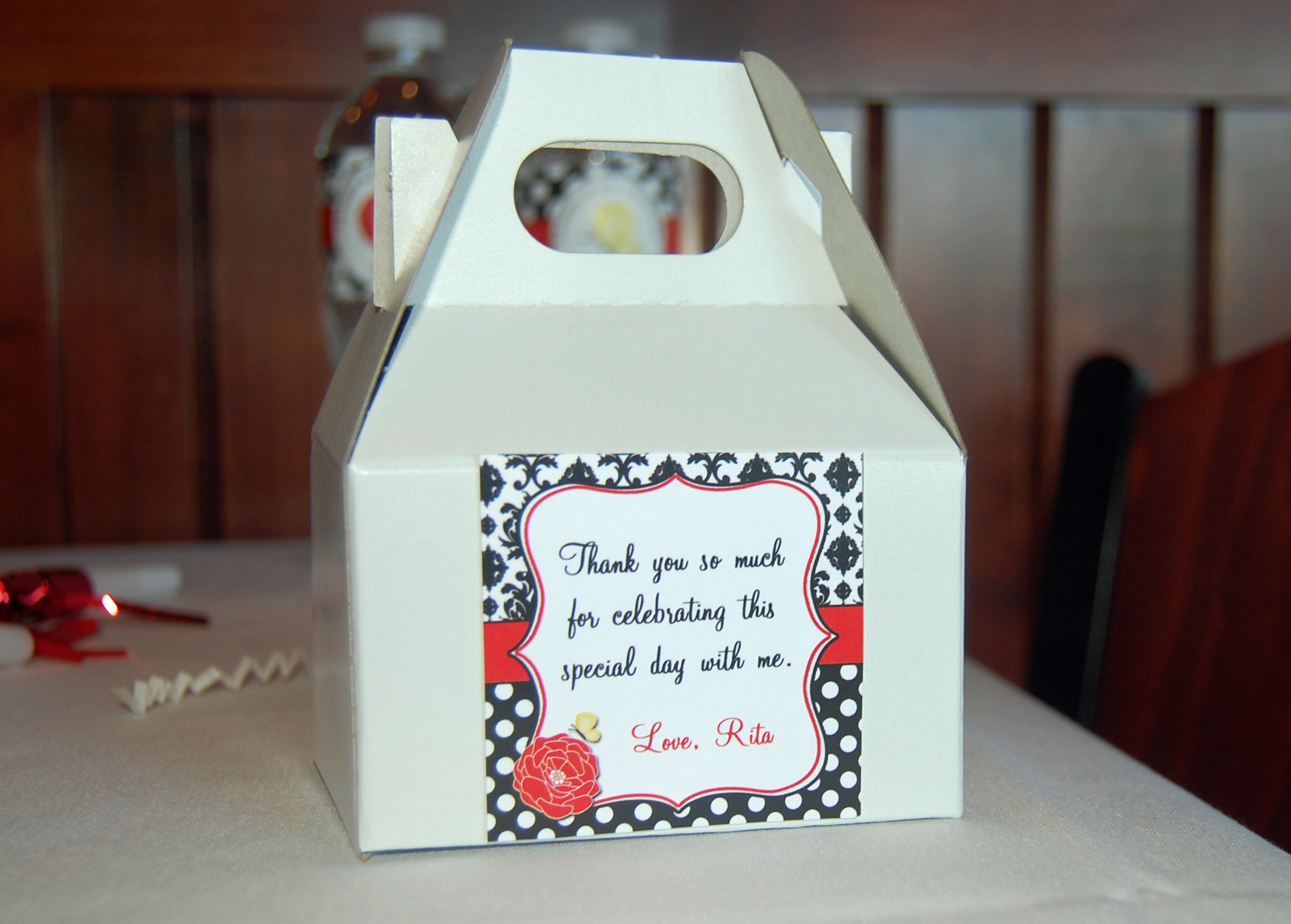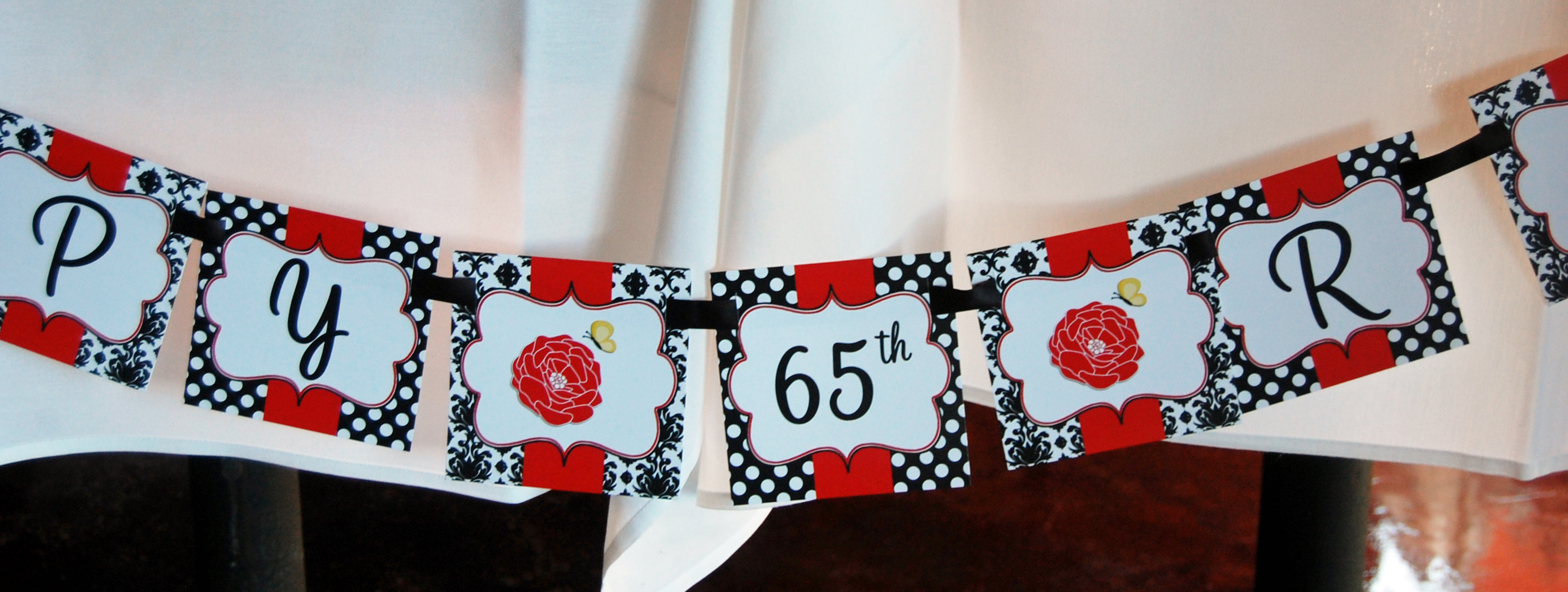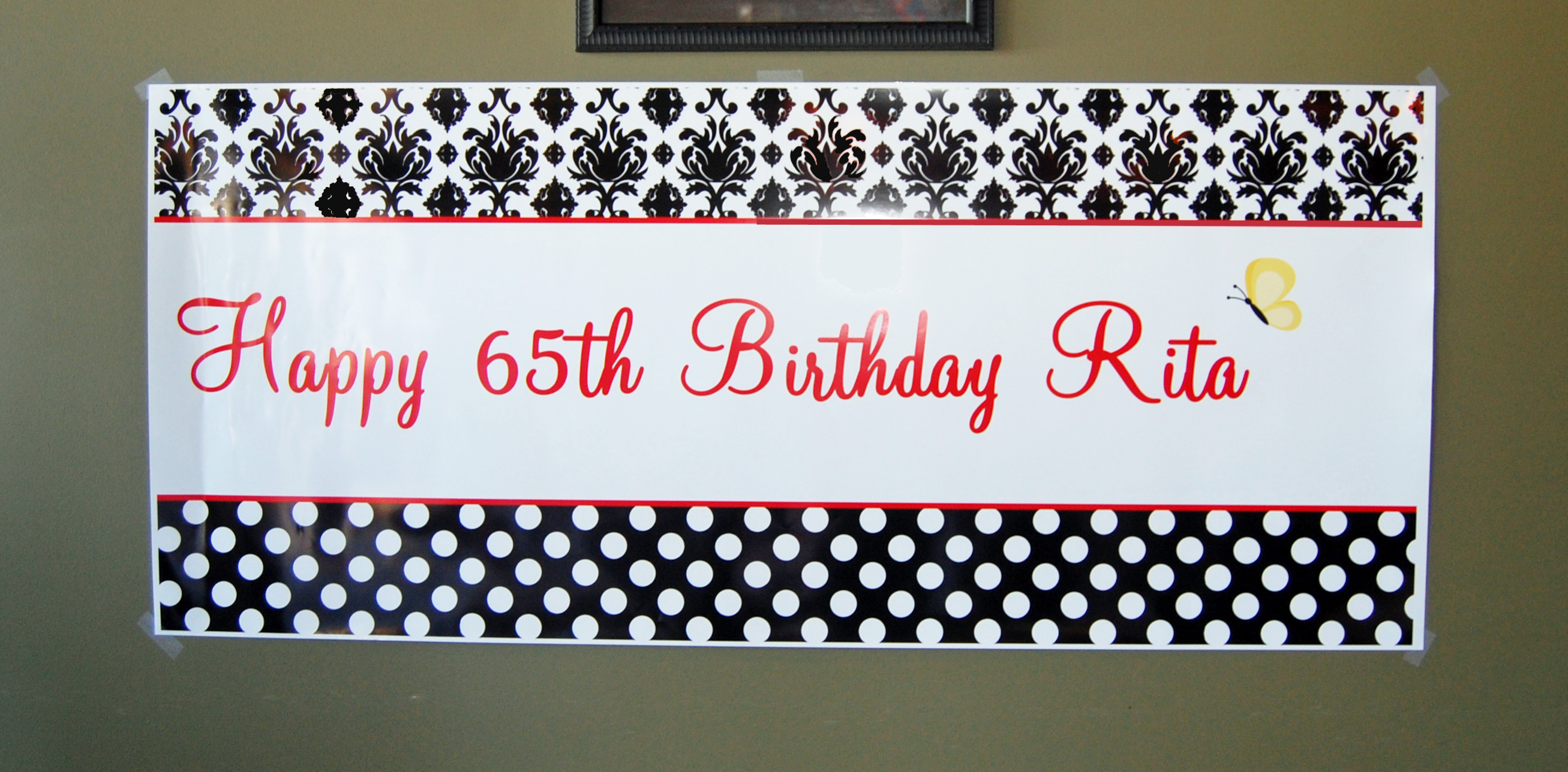 This party was given by her daughter, Katie, and Dawn from That Party Chick designed the graphics. Polka Dots and Damask styling in Black and White provided the design elements in Rita’s 65th birthday bash! A splash of red was the perfect color accent for the occasion. The yellow butterfly was in memory of her mother, who celebrated with them in spirit. A delicate red flower added a feminine touch. Banners held by ribbons and bows transformed the venue into a party palace!