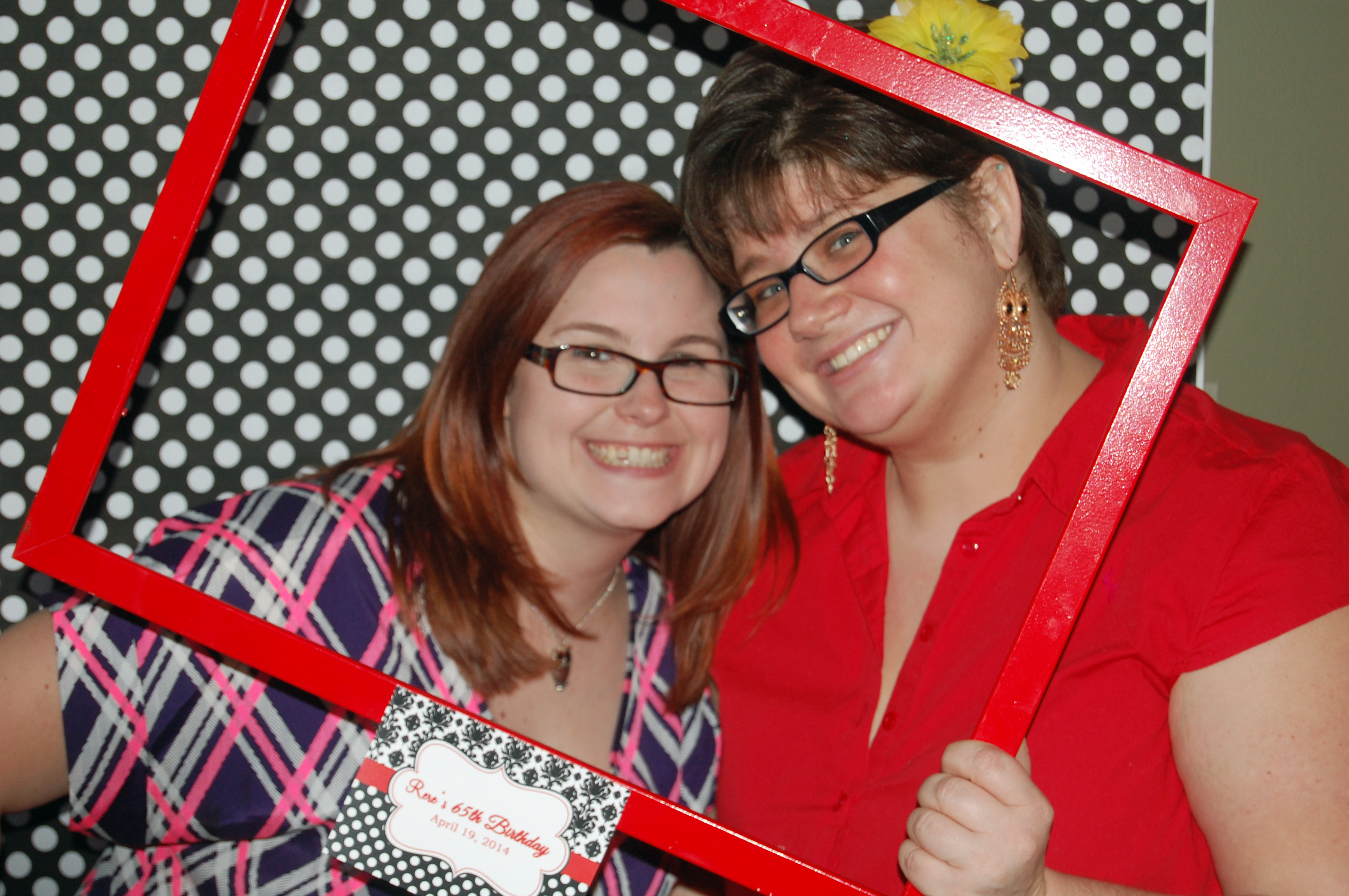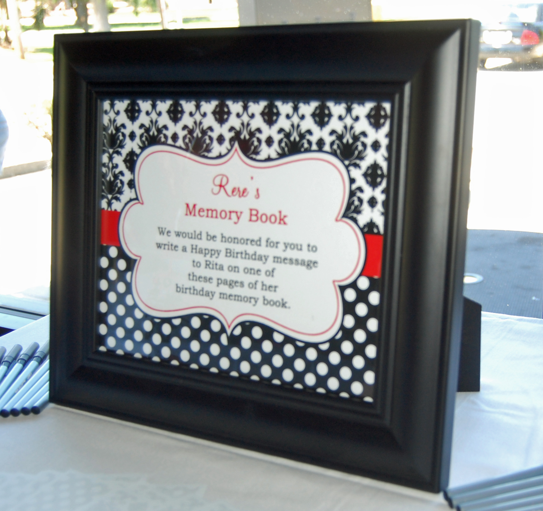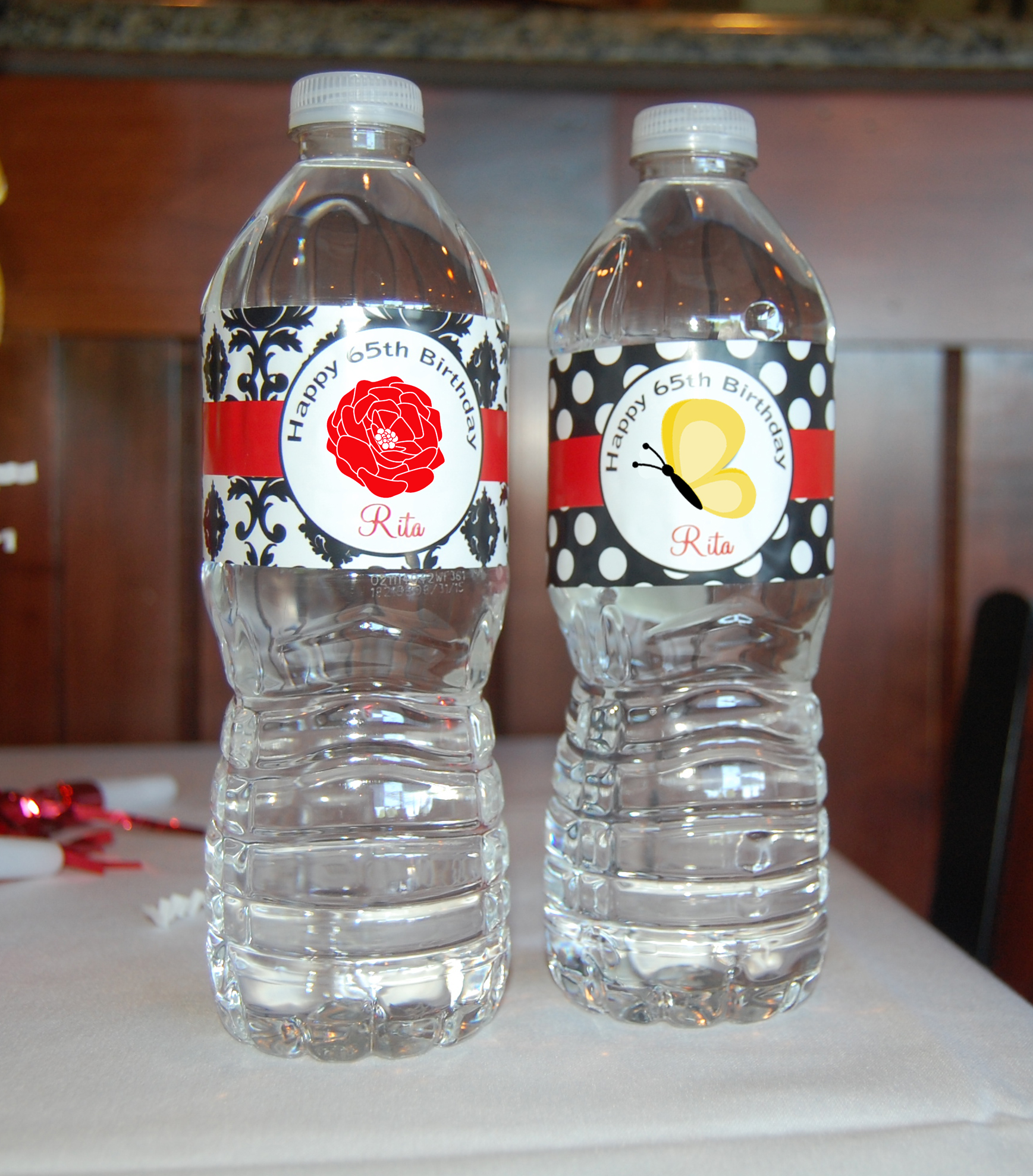 This party was given by her daughter, Katie, and Dawn from That Party Chick designed the graphics. Polka Dots and Damask styling in Black and White provided the design elements in Rita’s 65th birthday bash! A splash of red was the perfect color accent for the occasion. The yellow butterfly was in memory of her mother, who celebrated with them in spirit. A delicate red flower added a feminine touch. Banners held by ribbons and bows transformed the venue into a party palace!