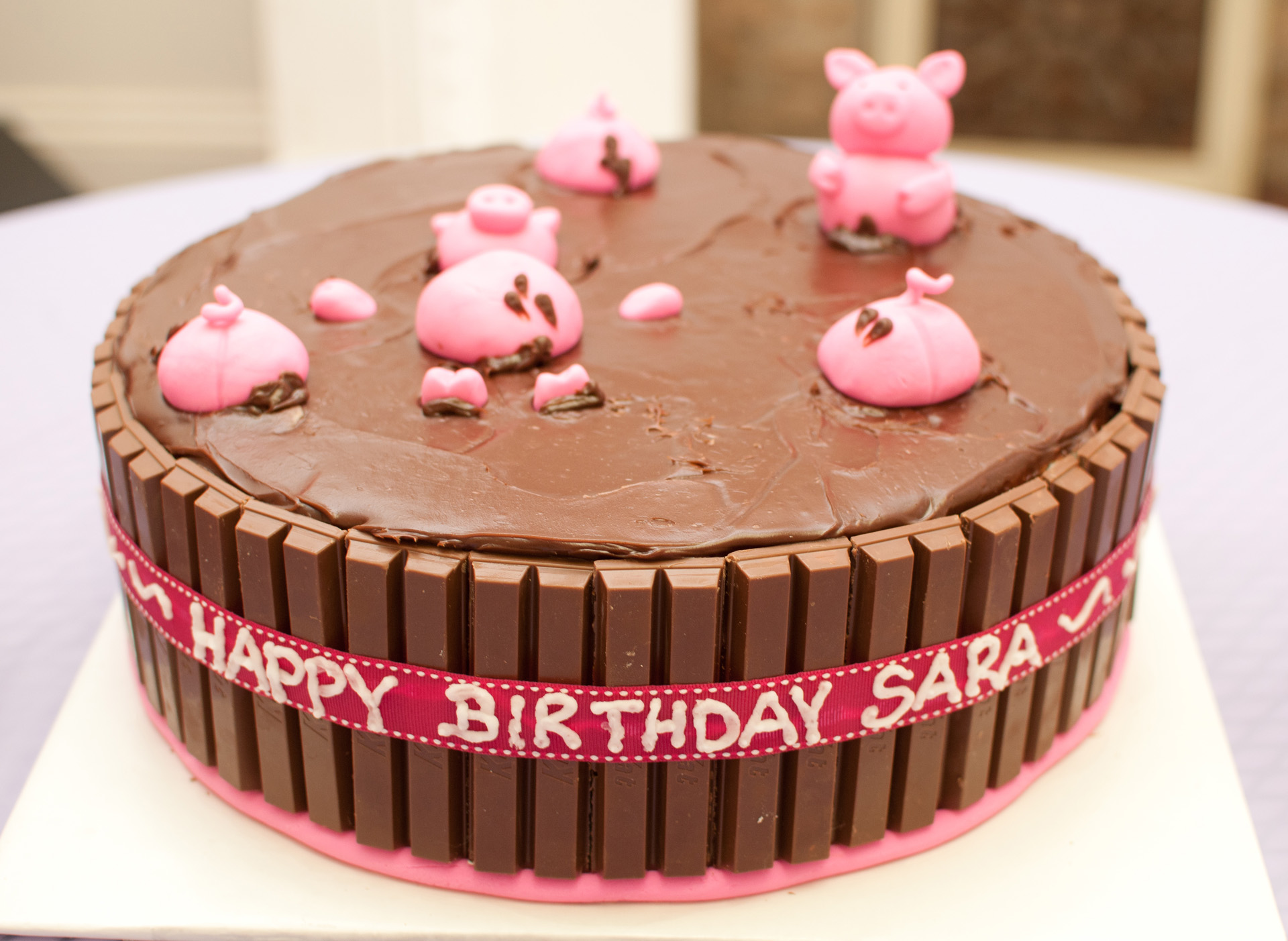 The adorable pig pen cake featured pigs wallowing in the mud, and was completed by “Happy Birthday Sara” encircling the chocolate candy fence!