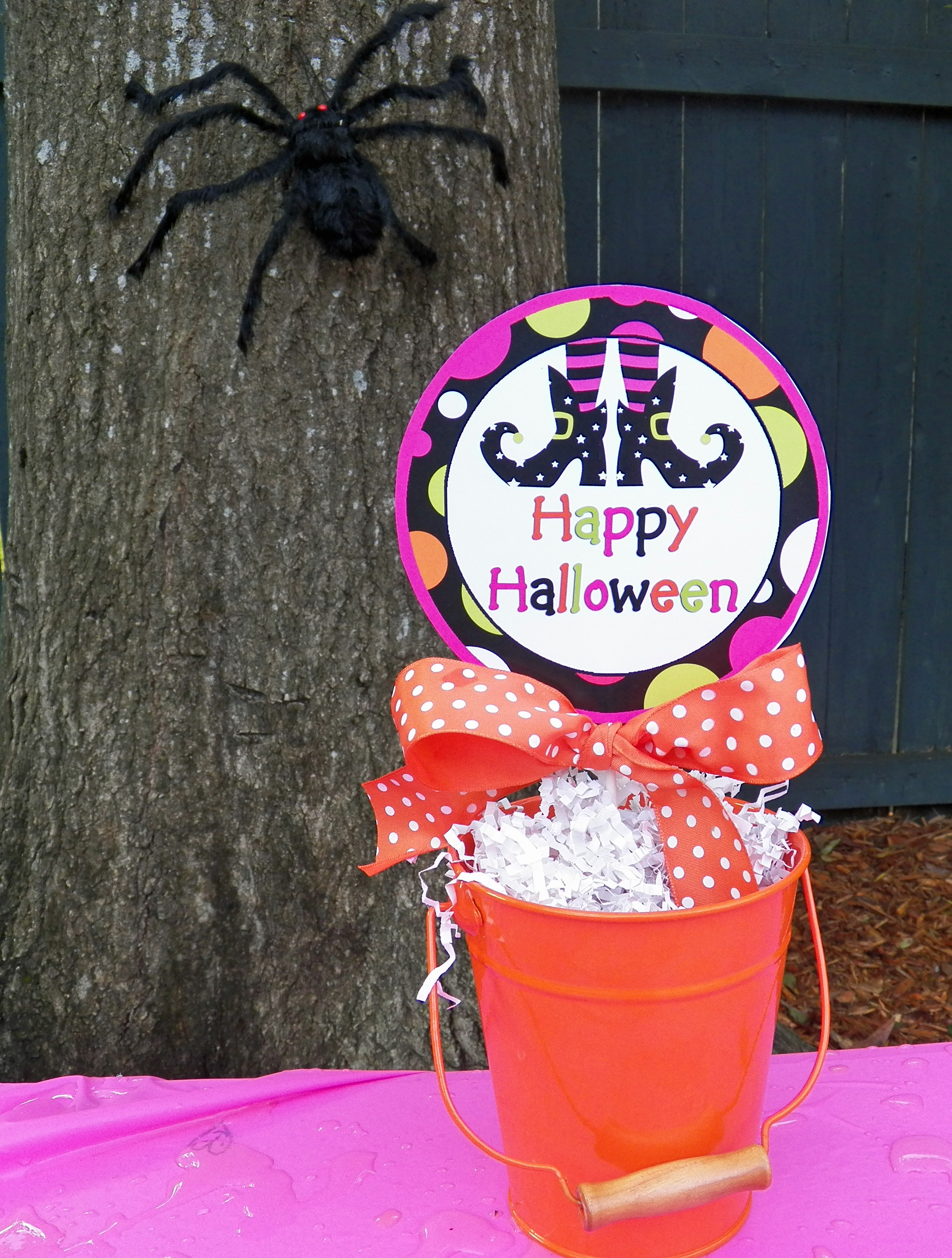 Hot dogs, chips, fresh fruit, and raw vegetables were just some of the party fare. Table centerpieces featuring a fun pair of witch shoes were mounted in orange buckets, and tied with orange polka dot ribbons.