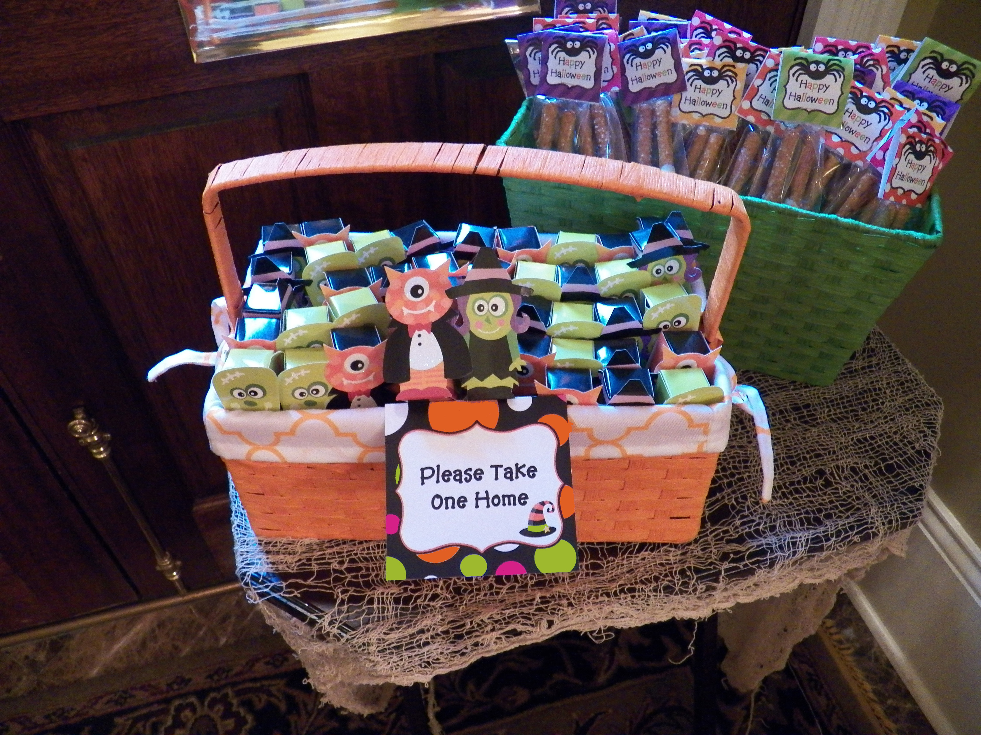 A karaoke machine brought out the musicians and made it a super fun dance party. There was something for everyone with even a bounce house in the yard! Orange and green baskets contained special treats, including “Happy Halloween” Pretzel Rods and “Take a Monster Home” candy boxes.